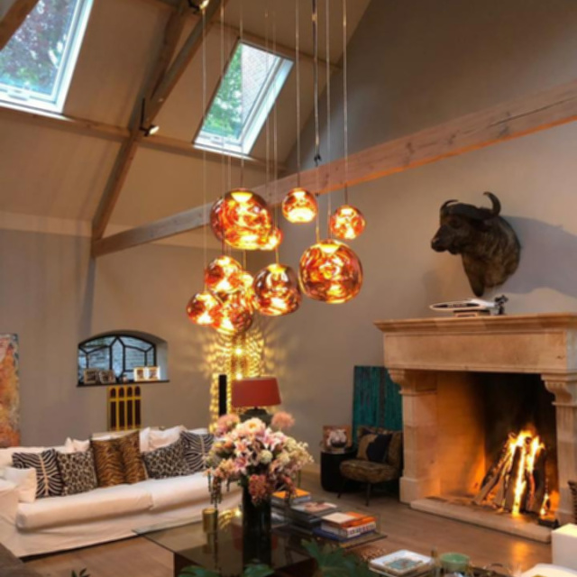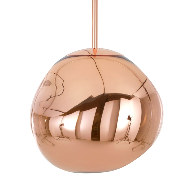 溶鉱炉で熱せられ、膨らんでいく吹きガラスのように、一見生命体のような意匠が特徴の「MELT(メルト)」。見る角度によって形が違って見えることから、ハンドメイドのガラス製品のように見えますが、シェードは射出成型されたポリカーボネートでできています。シェードの中は特殊な真空蒸着によって塗装され、シェード上部から底部にかけて塗装の濃度を段階的に変えることで、点灯時には、物体が溶けるような視覚効果を生み出し、消灯すると空気を漂う鏡面のオブジェへと変化します。トム・ディクソンが独自に開発した内蔵型LEDを使用することにより、電球タイプの「MELT(メルト)」よりも、シェード全体に光が行き渡って溶け落ちるような視覚効果を生み出し、全く違う照明へと進化を遂げました。