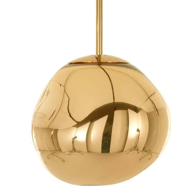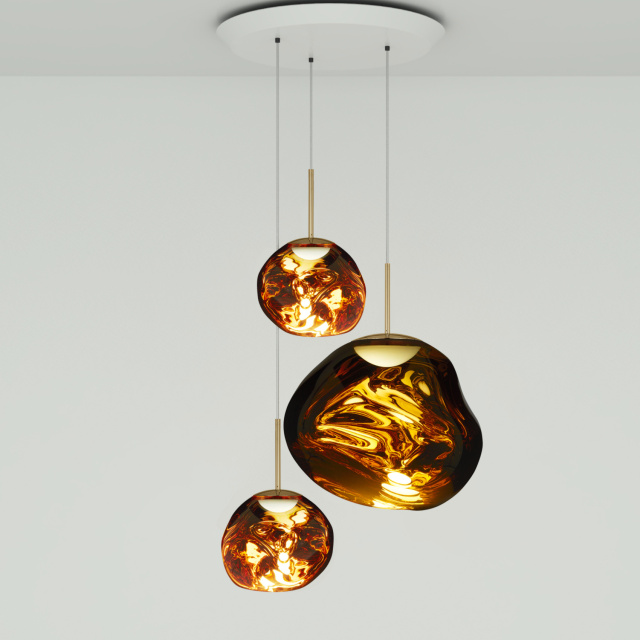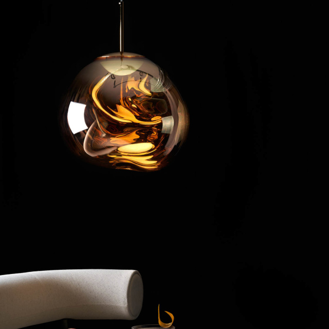 溶鉱炉で熱せられ、膨らんでいく吹きガラスのように、一見生命体のような意匠が特徴の「MELT(メルト)」。見る角度によって形が違って見えることから、ハンドメイドのガラス製品のように見えますが、シェードは射出成型されたポリカーボネートでできています。シェードの中は特殊な真空蒸着によって塗装され、シェード上部から底部にかけて塗装の濃度を段階的に変えることで、点灯時には、物体が溶けるような視覚効果を生み出し、消灯すると空気を漂う鏡面のオブジェへと変化します。トム・ディクソンが独自に開発した内蔵型LEDを使用することにより、電球タイプの「MELT(メルト)」よりも、シェード全体に光が行き渡って溶け落ちるような視覚効果を生み出し、全く違う照明へと進化を遂げました。