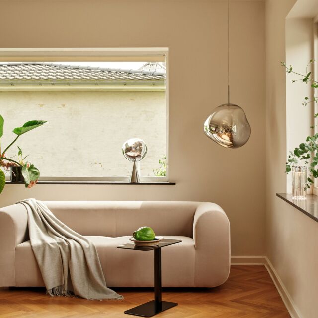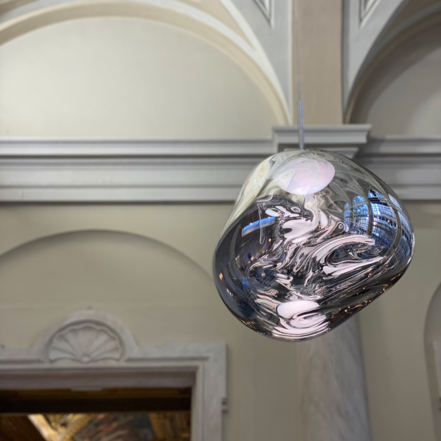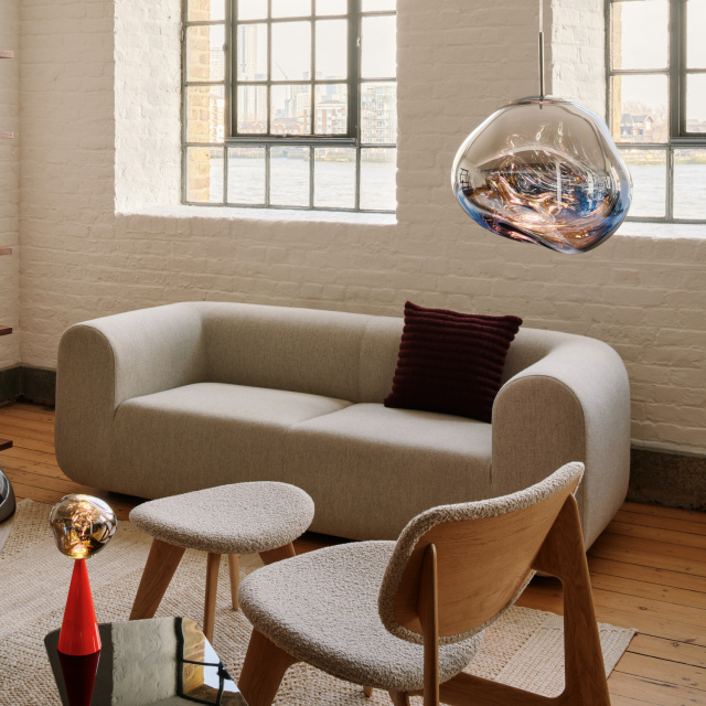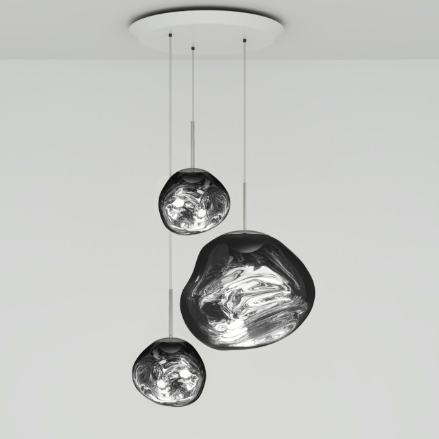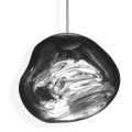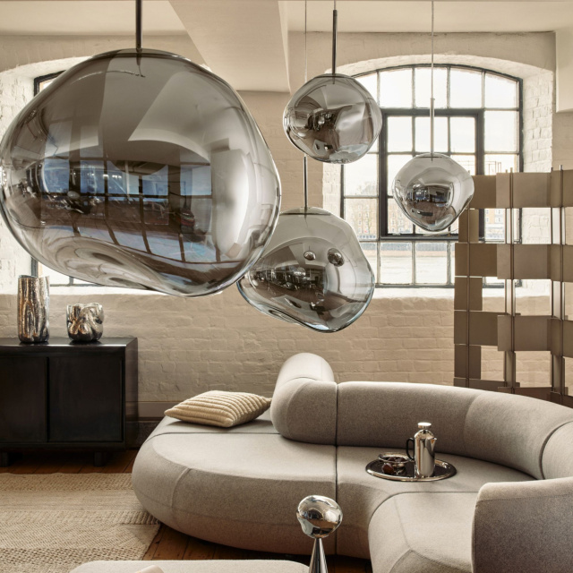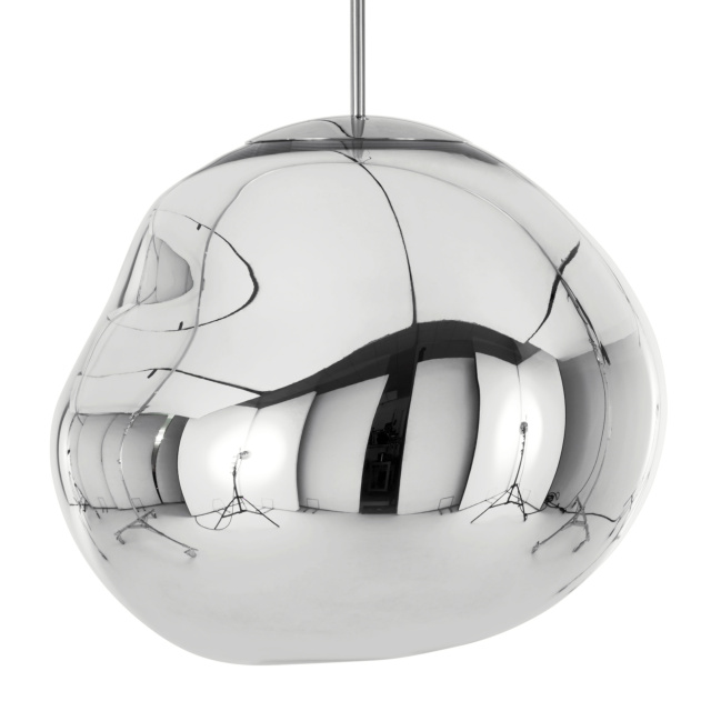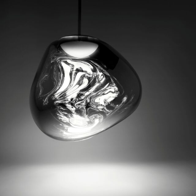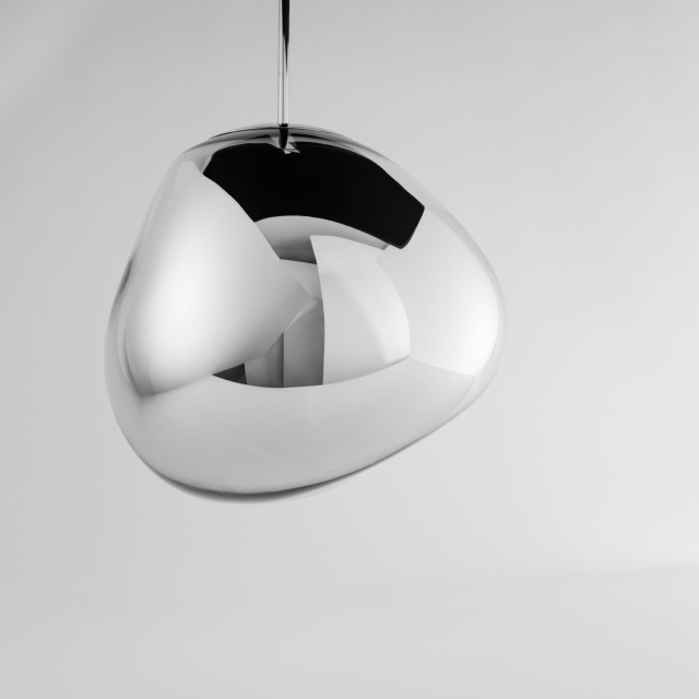 溶鉱炉で熱せられ、膨らんでいく吹きガラスのように、一見生命体のような意匠が特徴の「MELT(メルト)」。見る角度によって形が違って見えることから、ハンドメイドのガラス製品のように見えますが、シェードは射出成型されたポリカーボネートでできています。シェードの中は特殊な真空蒸着によって塗装され、シェード上部から底部にかけて塗装の濃度を段階的に変えることで、点灯時には、物体が溶けるような視覚効果を生み出し、消灯すると空気を漂う鏡面のオブジェへと変化します。トム・ディクソンが独自に開発した内蔵型LEDを使用することにより、電球タイプの「MELT(メルト)」よりも、シェード全体に光が行き渡って溶け落ちるような視覚効果を生み出し、全く違う照明へと進化を遂げました。