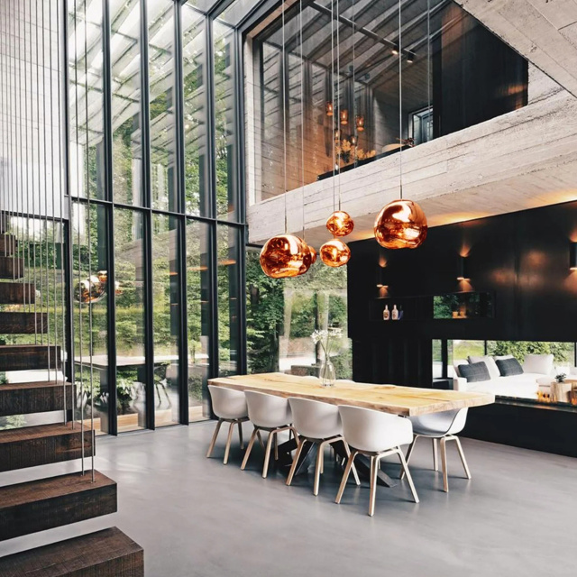 溶鉱炉で熱せられ、膨らんでいく吹きガラスのように、一見生命体のような意匠が特徴の「MELT(メルト)」。見る角度によって形が違って見えることから、ハンドメイドのガラス製品のように見えますが、シェードは射出成型されたポリカーボネートでできています。シェードの中は特殊な真空蒸着によって塗装され、シェード上部から底部にかけて塗装の濃度を段階的に変えることで、点灯時には、物体が溶けるような視覚効果を生み出し、消灯すると空気を漂う鏡面のオブジェへと変化します。トム・ディクソンが独自に開発した内蔵型LEDを使用することにより、電球タイプの「MELT(メルト)」よりも、シェード全体に光が行き渡って溶け落ちるような視覚効果を生み出し、全く違う照明へと進化を遂げました。