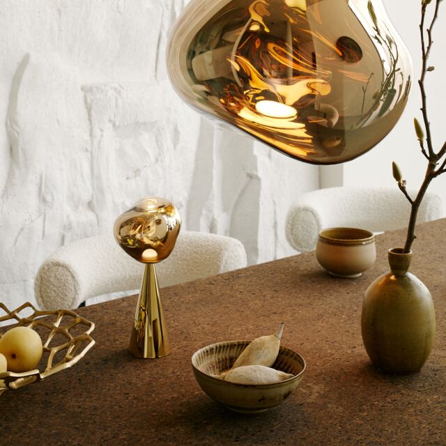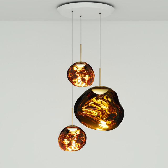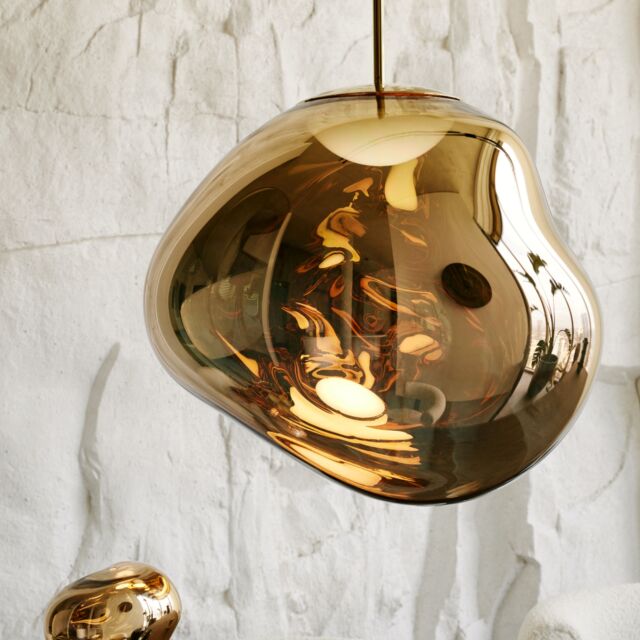 溶鉱炉で熱せられ、膨らんでいく吹きガラスのように、一見生命体のような意匠が特徴の「MELT(メルト)」。見る角度によって形が違って見えることから、ハンドメイドのガラス製品のように見えますが、シェードは射出成型されたポリカーボネートでできています。シェードの中は特殊な真空蒸着によって塗装され、シェード上部から底部にかけて塗装の濃度を段階的に変えることで、点灯時には、物体が溶けるような視覚効果を生み出し、消灯すると空気を漂う鏡面のオブジェへと変化します。トム・ディクソンが独自に開発した内蔵型LEDを使用することにより、電球タイプの「MELT(メルト)」よりも、シェード全体に光が行き渡って溶け落ちるような視覚効果を生み出し、全く違う照明へと進化を遂げました。