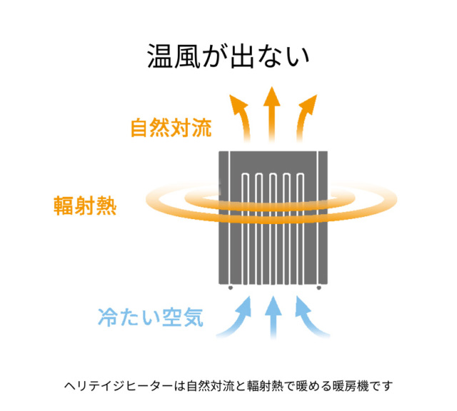 ヒーターユニットで空気を直接暖め、空気の自然対流と本体から出る輻射熱でファンを使わずにお部屋をあたためます。