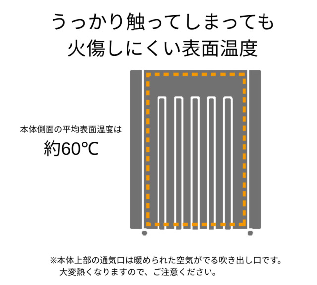 また、しっかりあたたかいけれど、本体の表面温度は平均で60度程度。小さなお子様やペットがうっかり触ってしまっても火傷しにくい温度です。お子さんから高齢の方、ペットなど、家族みんなにとって安全なあたたかさを提供します。