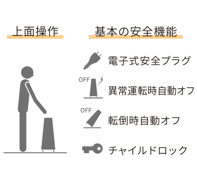 | 主な安全機能 | 電子式安全プラグ/異常運転感知/転倒時自動オフ/チャイルドロック |